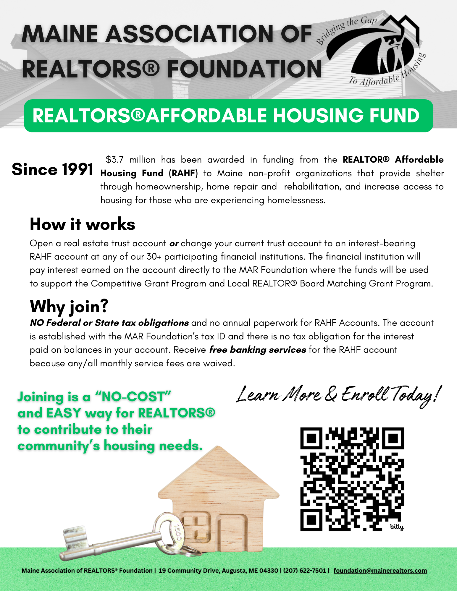 By using the button below, you can give directly to the Maine Association of REALTORS – REALTORS Affordable Housing Fund as it is a 501c3 public charity